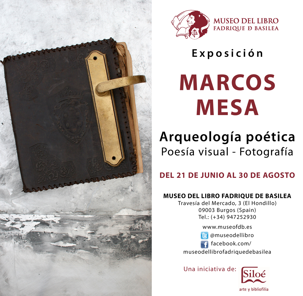 Arqueología poéticaMarcos Mesa’s new visual-poetry exhibition (in photography format) is named “Poetic Archaeology”. This is an initiative, named “Doble Espacio” (Double Space), from the Museum of the Book “Fadrique de Basilea” of Burgos, consists of completing empty spaces of the museum with little micro-exhibitions from local artists. “Poetic Archaeology” is a sample of several pictures over aluminum and methacrylate; compositions made of “found” objects of metallic nature. This exhibition is an extension of the project “Metal Poems” which consists of poem/object photographs.